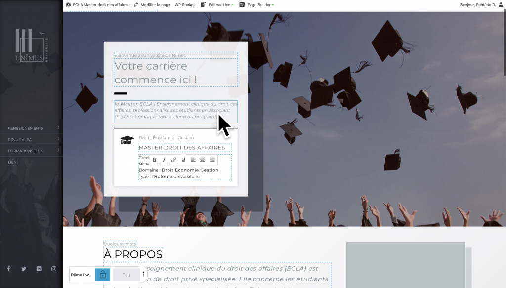 L’éditeur Live en Vidéo. Cet éditeur permet d’éditer le contenu de la page (texte, images, liens…) sans modifier la structure de celle-ci. Il est possible de limiter l’accès à cet outil par la gestion des rôles / accès.
